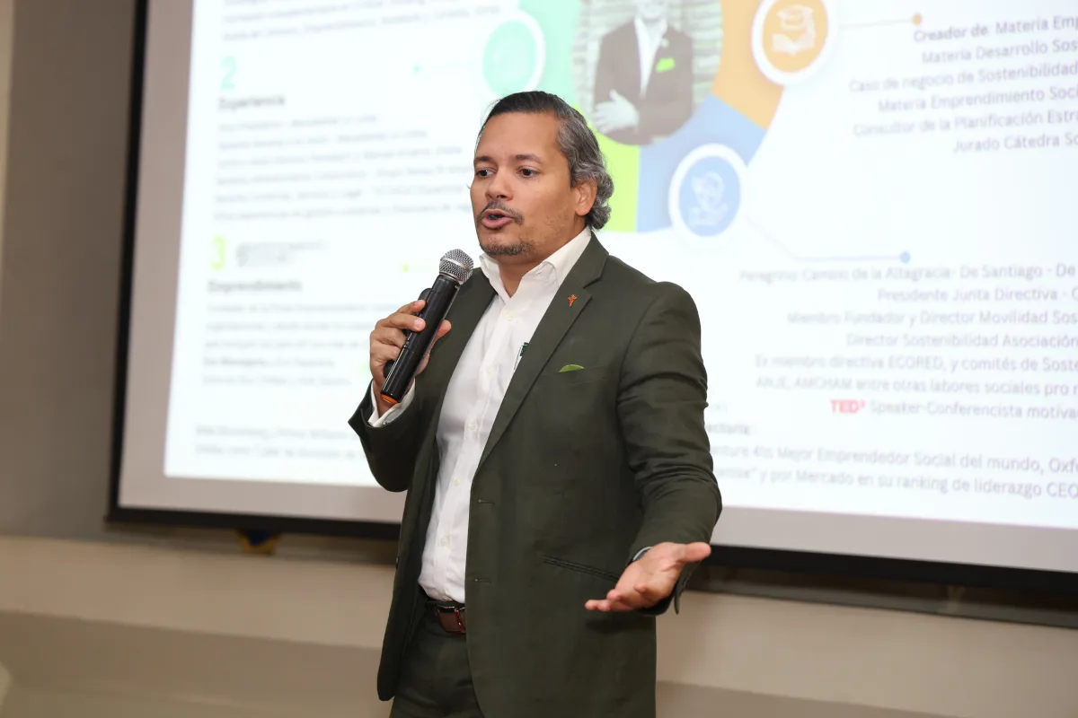 La masterclass fue impartida por Edison Santos, egresado de la PUCMM y fundador de la firma Emprendimiento Sostenible y de Eco Mensajería, quien abordó el desarrollo sostenible como un eje estratégico para la competitividad y la toma de decisiones empresariales. Durante su intervención, enfatizó la importancia de integrar criterios ambientales, sociales y de gobernanza en los modelos de negocio para garantizar su sostenibilidad en el largo plazo.