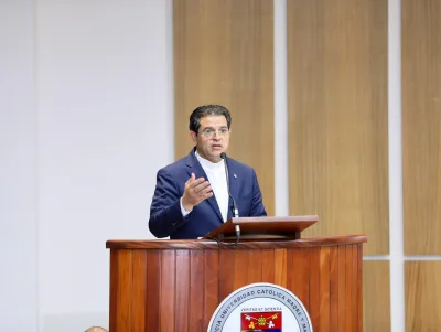 En las palabras de bienvenida, el rector de la PUCMM, reverendo padre doctor Secilio Espinal, destacó la importancia del diálogo entre el Gobierno, la academia y los sectores productivos para comprender los desafíos del desarrollo económico nacional. Asimismo, subrayó el papel de la Universidad como espacio de concertación y libre debate de ideas, que ha contribuido históricamente al fortalecimiento de la sociedad y la democracia dominicana.